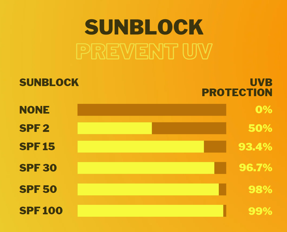 Mức độ chống lại tia UV có thể được quan sát qua thông số SPF của kem chống nắng, trong điều kiện hoàn hảo, chỉ số SPF có thể chặn được phần trăm tác hại từ tia UVB: