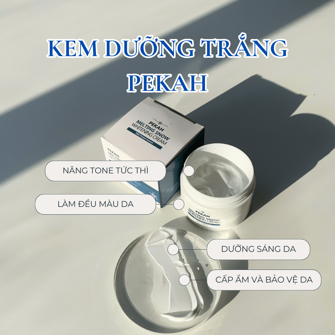 Chứa thành phần Niacinamide, protein từ sữa và adenosine, 3 thành phần này đều có công dụng giúp cấp ẩm, dưỡng trắng và bảo vệ da. Kem dưỡng Pekah có chất kem đặc, sánh mịn như sữa chua khi thoa lên da sẽ thẩm thấu nhanh và không gây bết dính. Kem còn có khả năng nâng tone tức thì hiệu quả, giúp các nàng thay thế được lớp nền makeup nhờ vào độ nâng tone tự nhiên của sản phẩm. Với cách dưỡng da này bạn sẽ cải thiện được sự không đều màu da, giảm sự thâm nám. Hơn nữa, đối với những làn da đã xuất hiện nếp nhăn và bắt đầu có dấu hiệu lão hóa thì sử dụng kem dưỡng trắng này là một lựa chọn hoàn hảo. Thành phần Adenosine có khả năng phục hồi da chảy xệ, cải thiện nếp nhăn và ngăn ngừa lão hóa. Sử dụng kem dưỡng trắng Pekah hằng ngày sẽ giúp nuôi dưỡng làn da của bạn từ sâu bên trong, mang lại vẻ mịn màng, căng mướt.