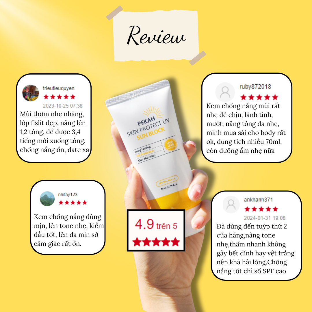 Là một trong những sản phẩm BEST SELLER của nhà Pekah, kem chống nắng Pekah Protect UV Sun Block thành công trong việc đem lại sự hài lòng cho khách hàng. Hãy cùng xem qua những đánh giá từ khách hàng mà sản phẩm này nhận được nhé: