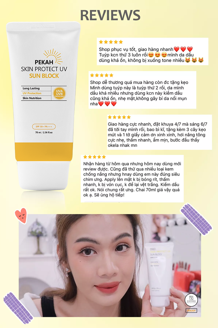 - Đặc biệt là những cô nàng ưa chuộng nét đẹp tự nhiên và không muốn mất nhiều thời gian cho makeup thì kem chống nắng PEKAH SKIN PROTECT UV SUN BLOCK là sự lựa chọn phù hợp với làn da nhẹ nhàng nhưng được bảo vệ kỹ càng.