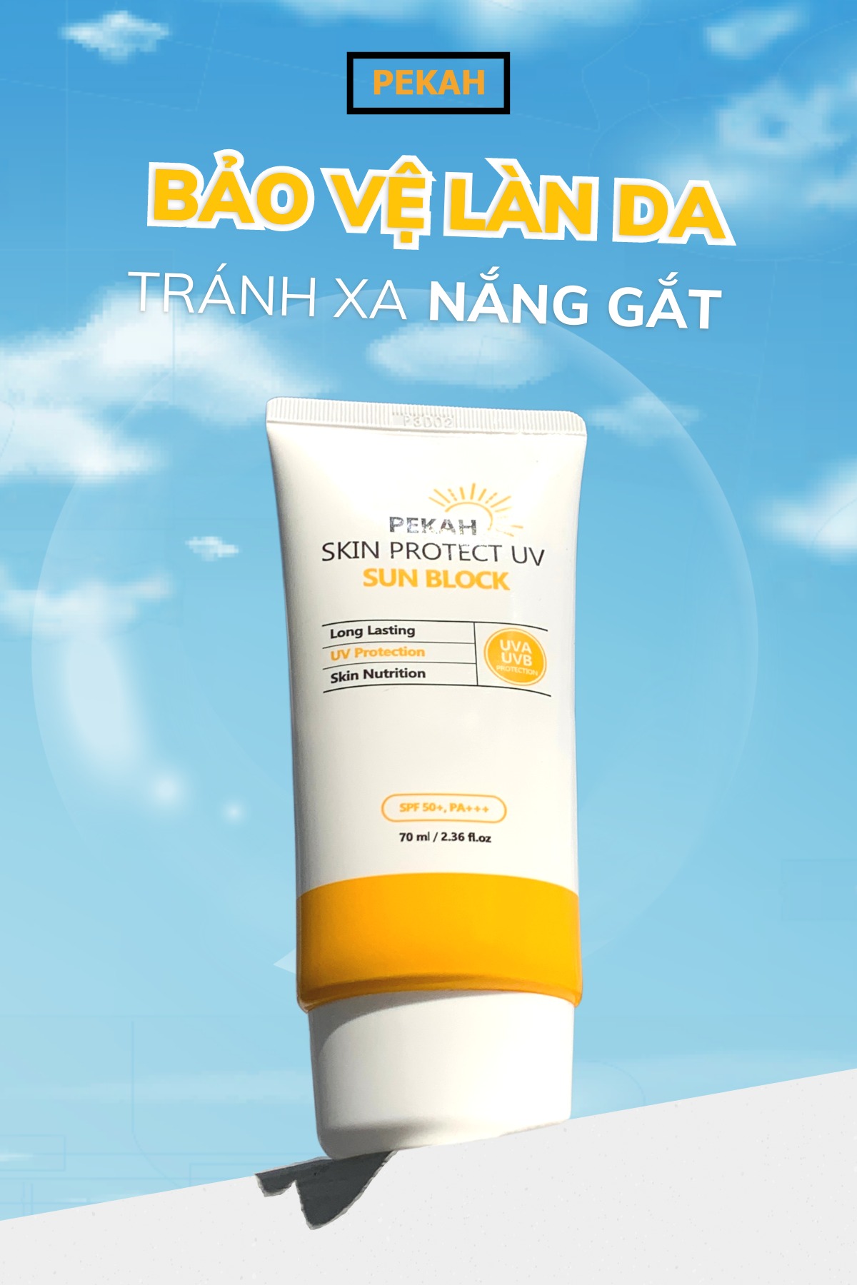 Kem chống nắng PEKAH với công dụng kép: chống nắng và nâng tone, cùng với chỉ số chống nắng cao SPF50+, PA+++ có khả năng chống nắng lên đến 90% và chống được cả tia UVA lẫn UVB. Là sản phẩm đến từ Hàn Quốc với thiết kế nắp vặn độc đáo, chống bung nắp, tràn kem khi đem đi xa. Hạn sử dụng lên đến 3 năm kể từ ngày sản xuất.