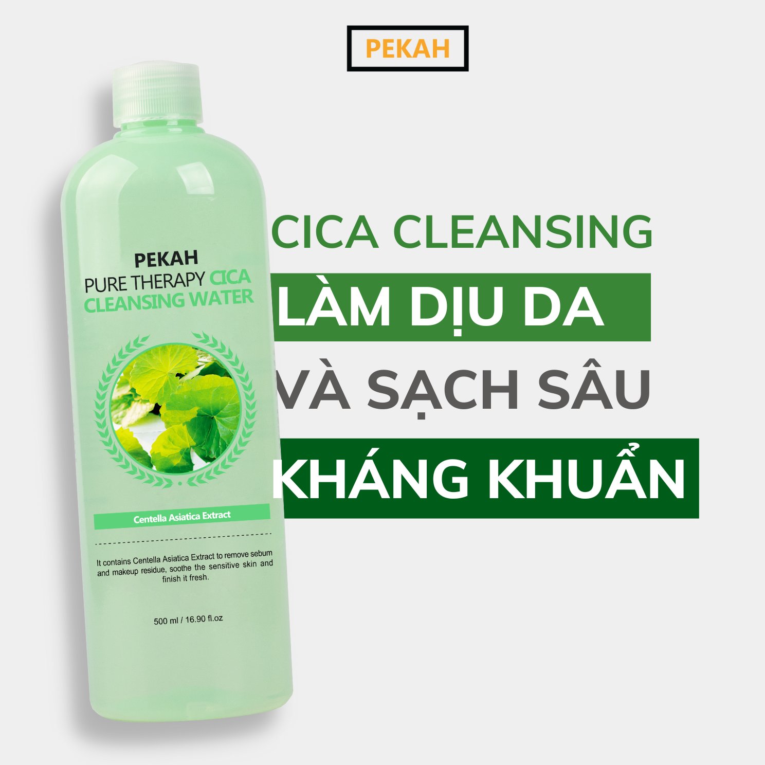 Nước tẩy trang rau má của Pekah có tên gọi đầy đủ là “ Nước Tẩy Trang Sạch Sâu , Kháng Khuẩn Và Làm Dịu Nhẹ Chiết Xuất Rau Má Dành Cho Da Nhạy Cảm PEKAH 500ml - PEKAH Pure Therapy Cica Cleansing Water 500ml”.