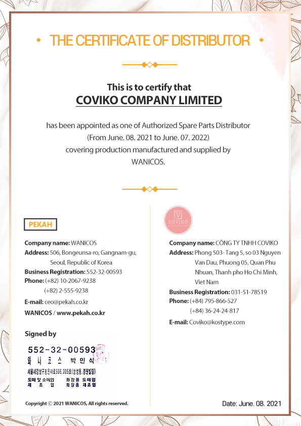 GIẤY CHỨNG NHẬN PHÂN PHỐI ĐỘC QUYỀN SẢN PHẨM PEKAH TẠI VIỆT NAM CỦA COVIKO